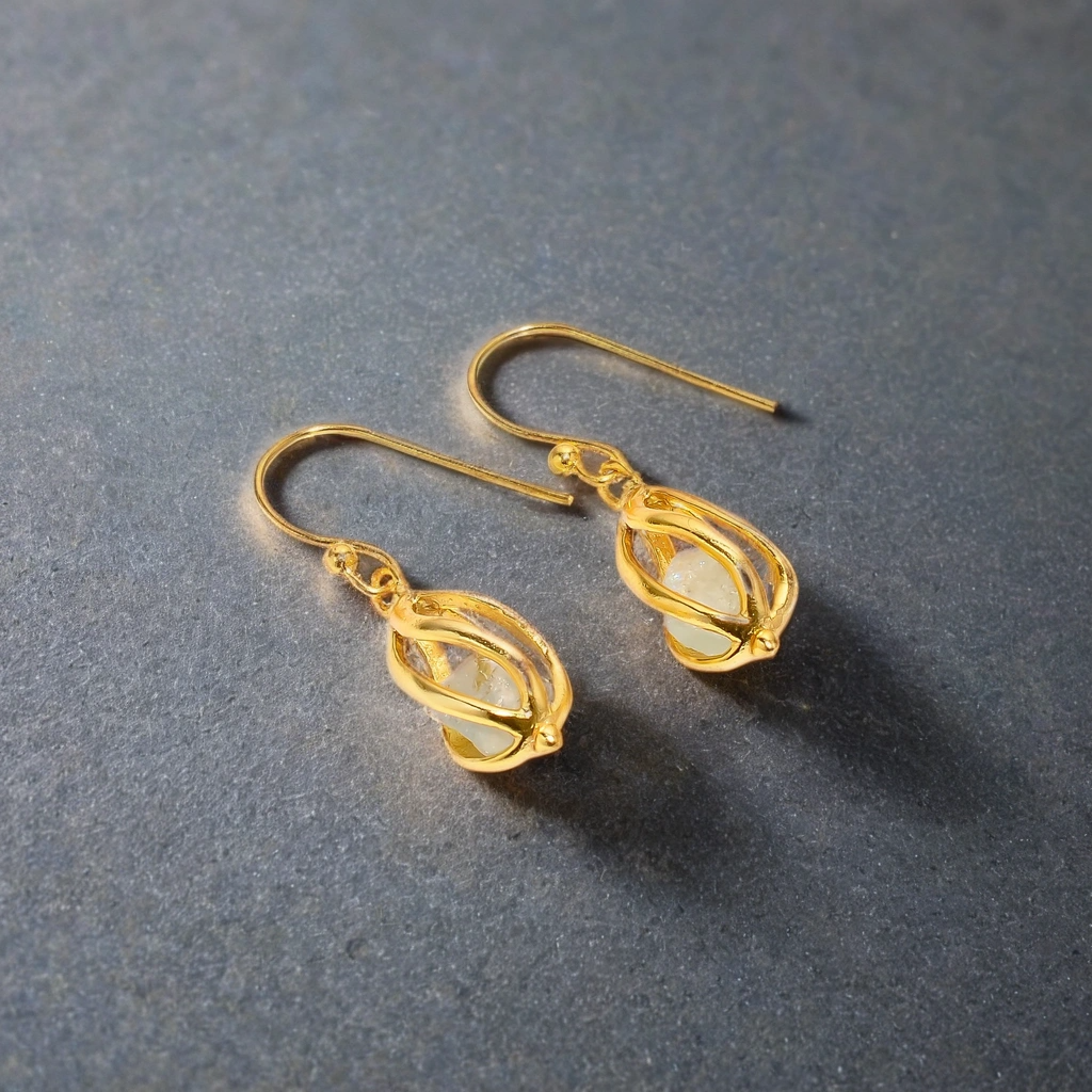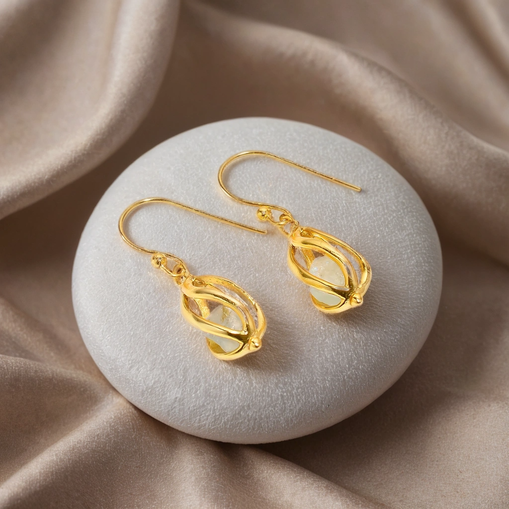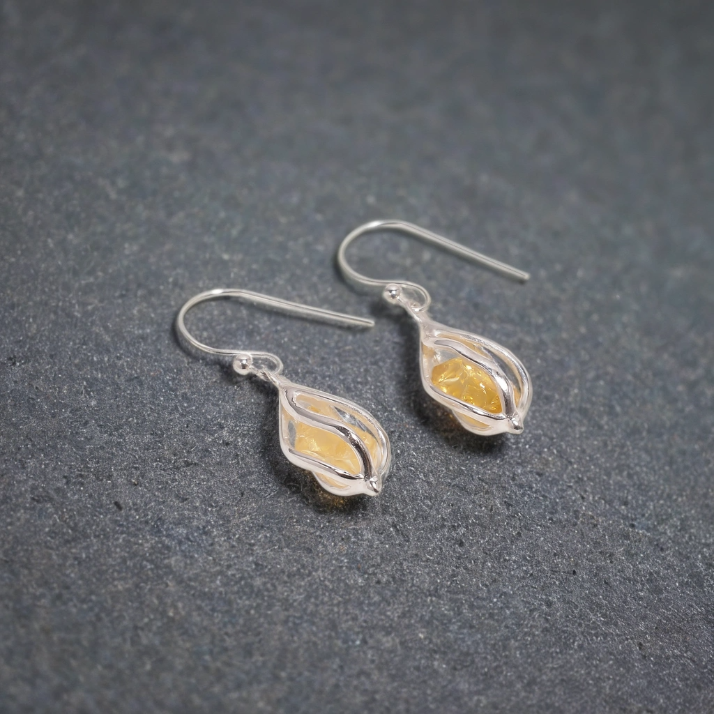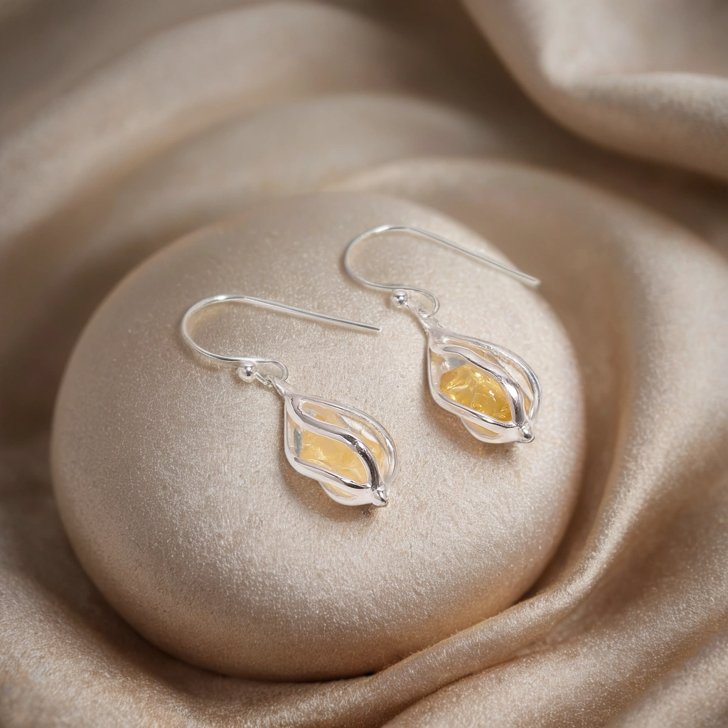 Handcrafted in sterling silver, this elegant dangle earring exudes timeless sophistication. Its sculpted, curved caged form cradles a luminous Citrine stone, creating a play of light with every movement. A statement of modern artistry, Enviya embodies quiet luxury and graceful refinement for discerning wearers.
