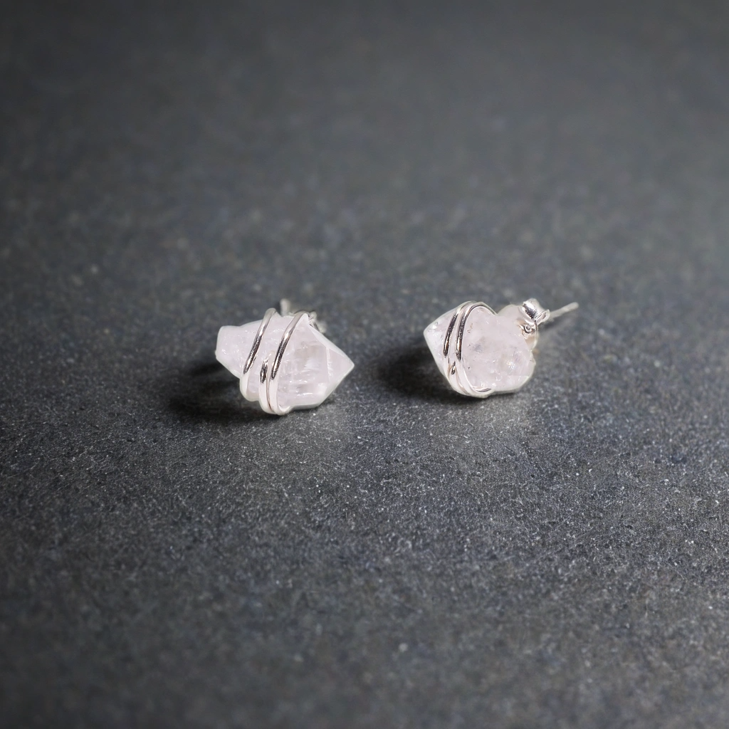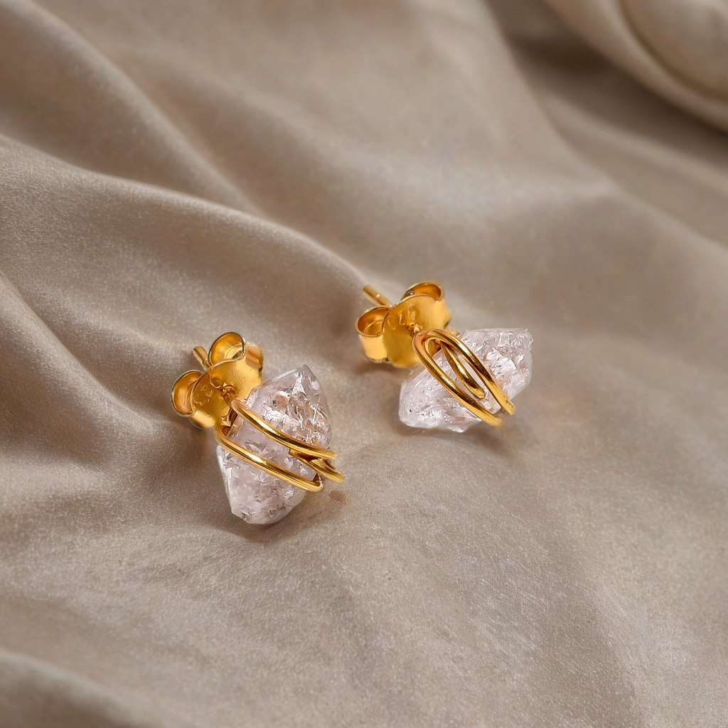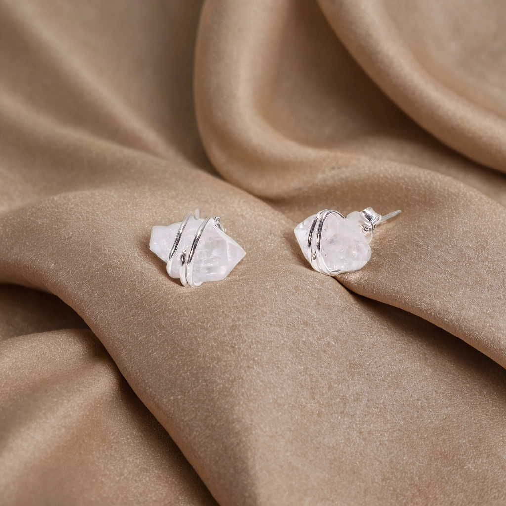 Ruvaya is a handcrafted stud earring in sterling silver, elevated. A luminous Herkimer Diamonde rests gracefully, delicately embraced by silver wire artistry. Exuding understated sophistication, this timeless creation reflects modern elegance, fine craftsmanship, and the quiet allure of contemporary luxury jewellery.